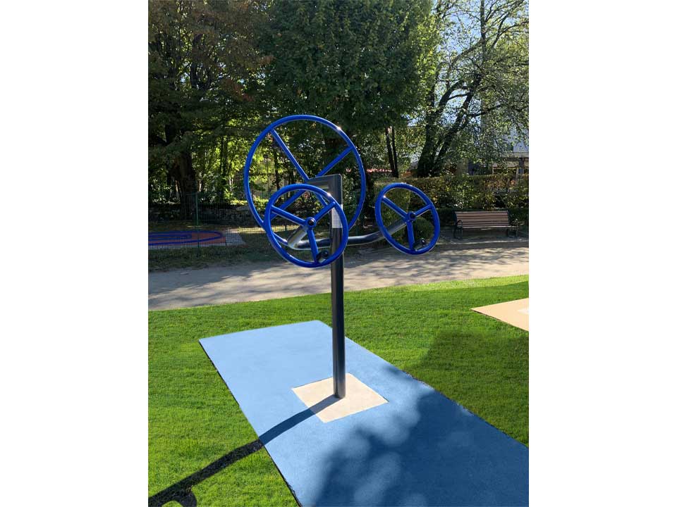 Alignez votre corps sur les roues. Écartez et pliez un peu vos jambes. Saisissez les poignées et roulez les roues dans la même direction ou dans la direction opposée.