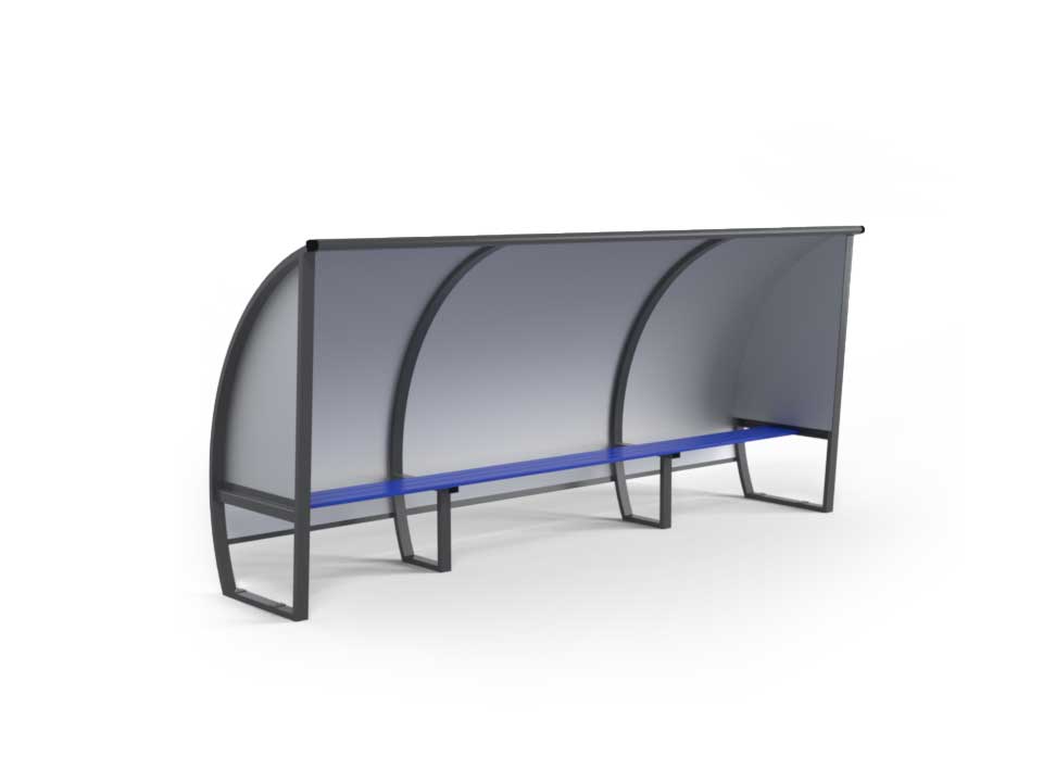 Abri de touche en aluminium, capacité 7 joueurs, hauteur 2m. Banc en aluminium. Arrière en tôle aluminium/PVC. Ancrage inclus.