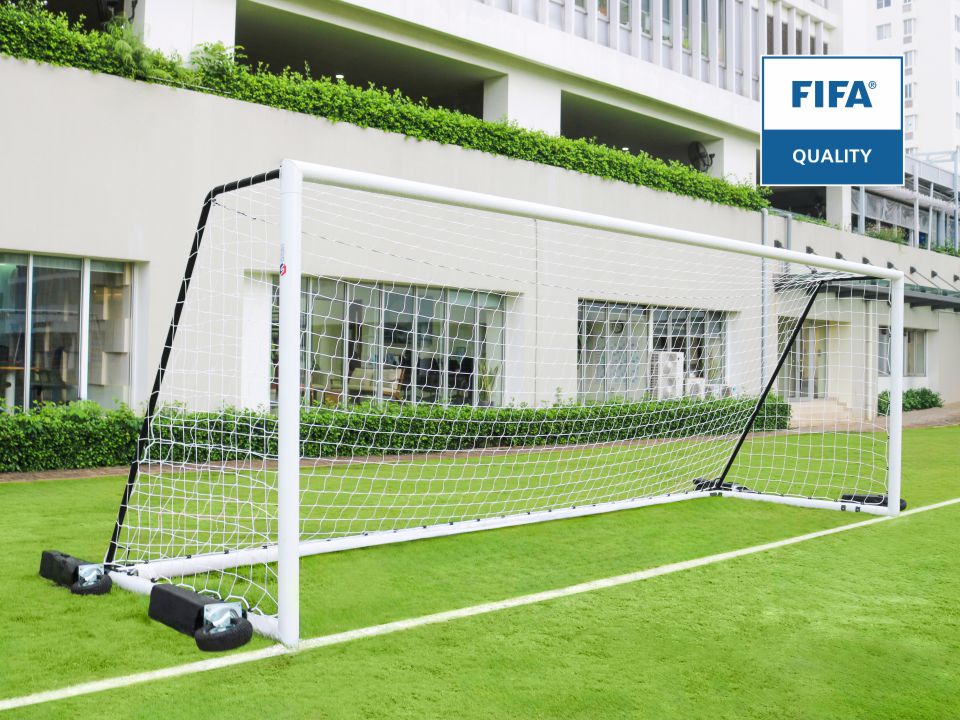 But de foot à 11 transportable aluminium certifié FIFA avec contrepoids intégrés et kits roues 360°