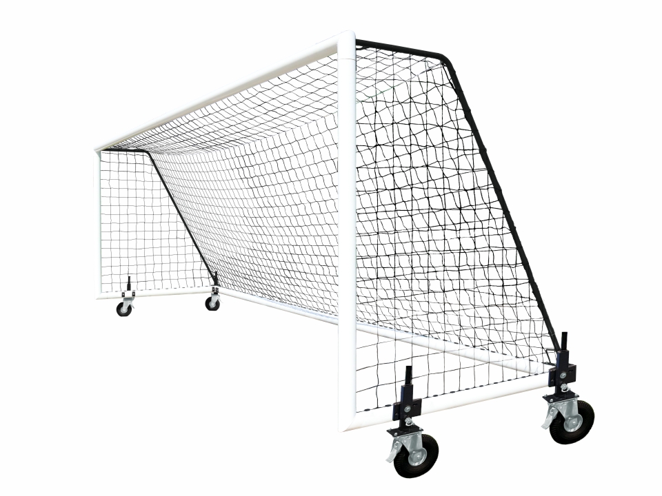 But de foot à 11 transportable en aluminium certifié FIFA, avec contrepoids intégrés et kits roues 360°.