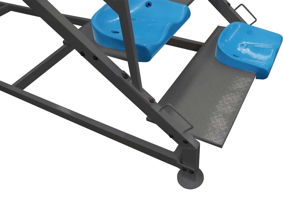 Structure avec barres de renfort et pieds métalliques pour une rigidité et une stabilité optimale. | Roues en position arrière pour faciliter le déplacement | Garde-corps 40x20mm et plancher anti-dérapant pour assurer la sécurité des utilisateurs | |