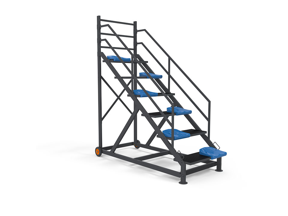 Avec garde-corps, plancher anti-dérapant et roues pour le déplacement.