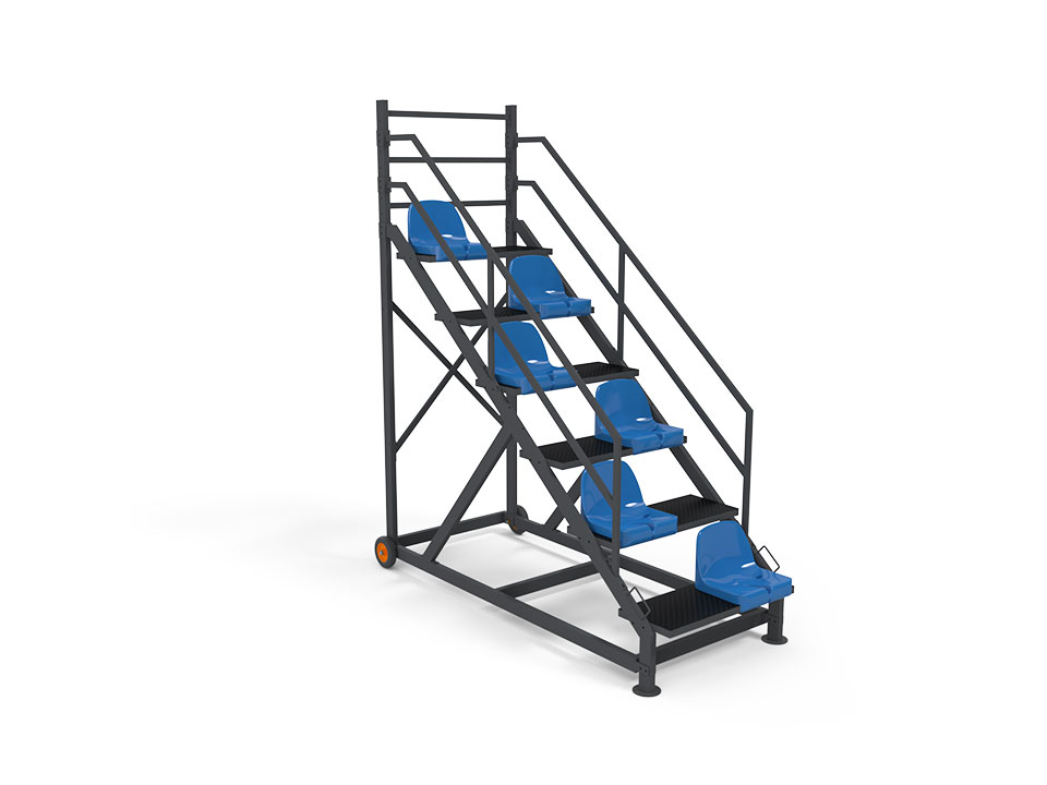 Poste d’arbitrage avec 6 places offrent une visibilité optimale pour les arbitres | Roues en position arrière pour faciliter le déplacement | Garde-corps 40x20mm et plancher anti-dérapant pour assurer la sécurité des utilisateurs | |