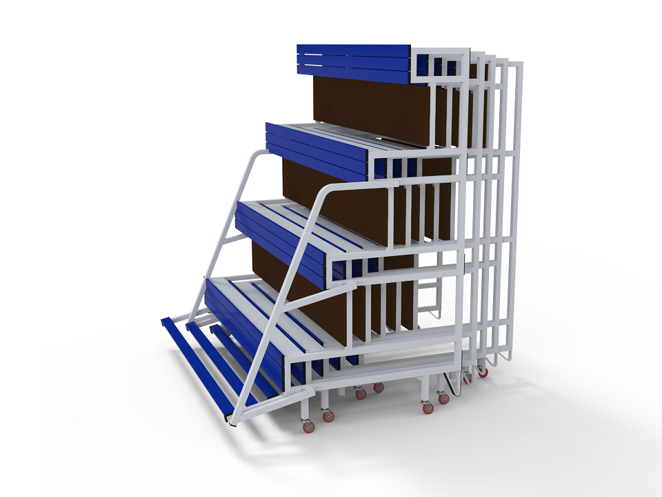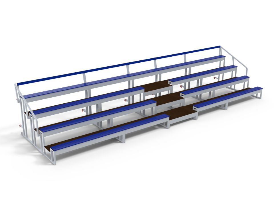 Gradins mobiles emboîtables prémiums 4 rangs pour terrains de sports et gymnases.